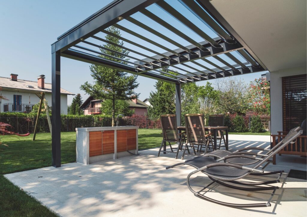 Grâce à ses lames orientables, la pergola bioclimatique protège efficacement du soleil, de la pluie et du vent tout en assurant une ventilation naturelle.