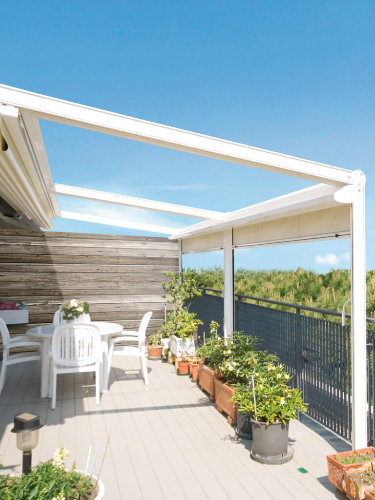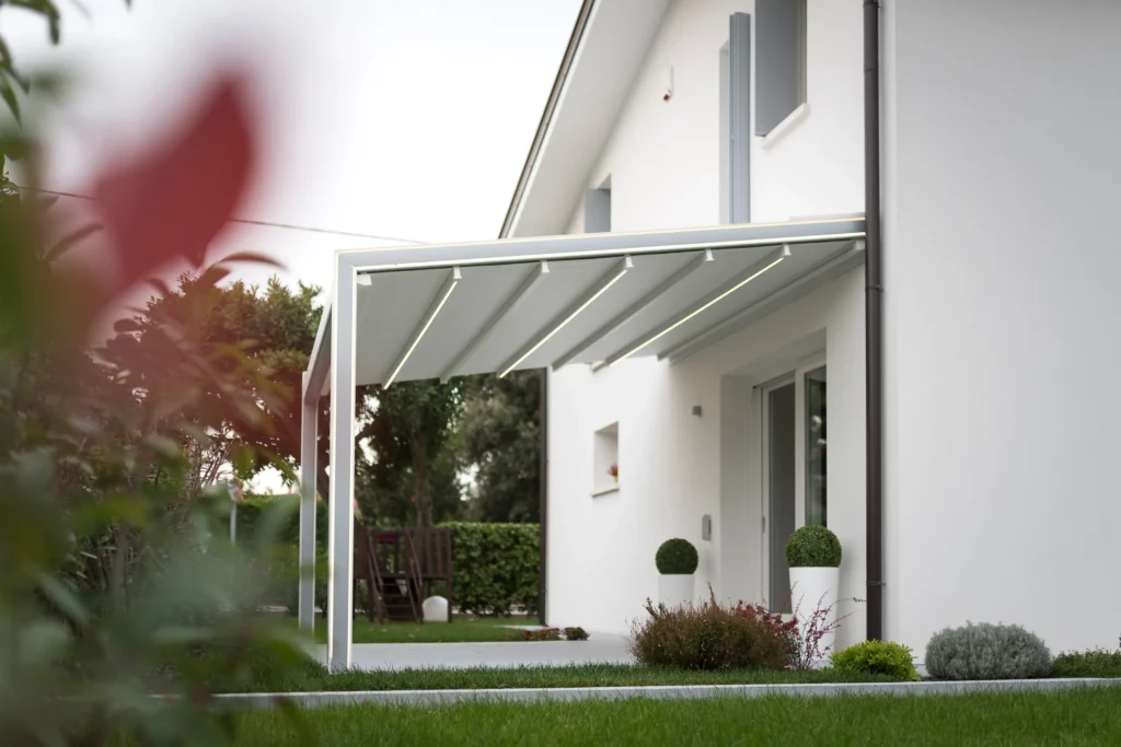 La pergola à toile rétractable (comme le modèle Gennius de KE) est aussi une solution idéale et parfaitement étanche. Ses avantages :